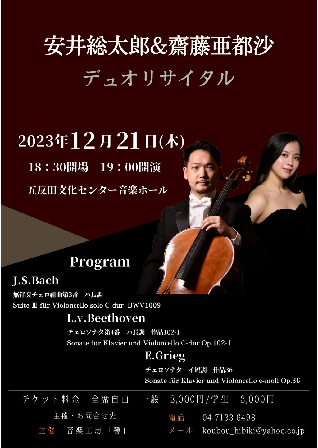 安井総太郎 チェロリサイタル 安井総太郎 & 斎藤亜都沙 デュオリサイタル 奥村智洋 x 安井耕一 ブラームスの夕べ 東京・札幌公演 安井耕一 x 雁部一浩 特別座談会 Vol.2 〜テクニックについて 「安井耕一 LIVE」CD販売のお知らせ